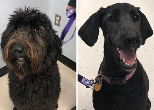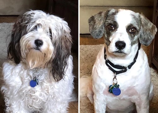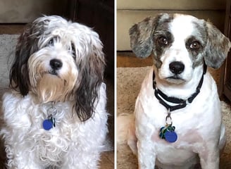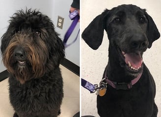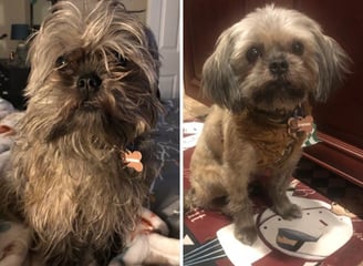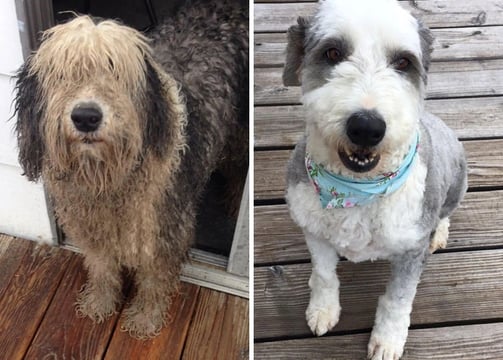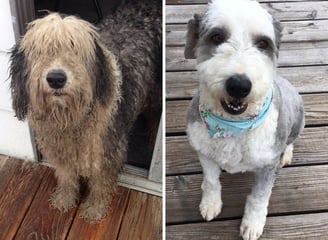 Ce chien était plein de nœuds et un peu négligé. Après un bon shampoing, un brossage soigné et une tonte adaptée, il repart tout léger.